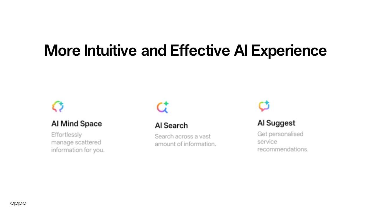 ฟีเจอร์ AI Mind Space พัฒนาขึ้นด้วยเทคโนโลยี Google Gemini เพื่อให้สามารถตอบคำถามแบบเฉพาะตัวบุคคลโดยอ้างอิงจากข้อมูลที่บันทึกไว้ในอุปกรณ์ นอกจากนี้ OPPO ยังได้ร่วมมือกับ Google Cloud พัฒนาเทคโนโลยี AI Search ให้มีประสิทธิภาพมากขึ้น ช่วยให้ระบบเข้าใจภาษาธรรมชาติได้ดีกว่าเดิม ทำให้ผู้ใช้งานสามารถค้นหาข้อมูลข้ามแอปพลิเคชันต่าง ๆ ได้อย่างราบรื่นด้วยภาษาพูดที่ใช้ในชีวิตประจำวัน เพื่อให้คาดการณ์ความต้องการของผู้ใช้ได้อย่างแม่นยำ AI Suggest ผสมผสานบริบทปัจจุบันจากตัวเครื่องเข้ากับข้อมูลในหน่วยความจำ เพื่อสร้างโปรไฟล์ผู้ใช้ที่มีการปรับเปลี่ยนอยู่เสมอ ช่วยให้สามารถนำเสนอคำแนะนำล่วงหน้าได้อย่างเหมาะสม และทันท่วงที
