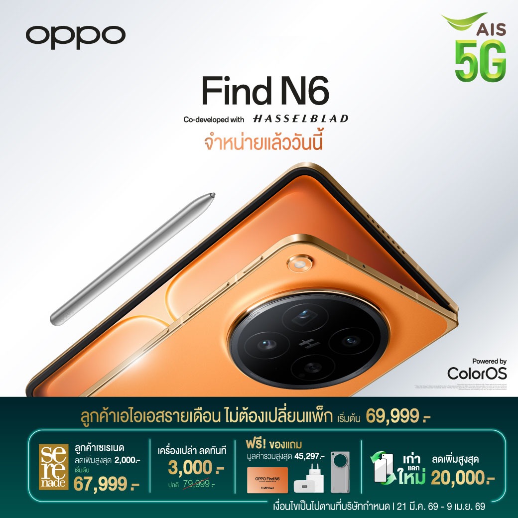 กรุงเทพฯ, 23 มีนาคม 2569 – ออปโป้ ประเทศไทย เปิดตัว OPPO Find N6 สมาร์ตโฟนจอพับรุ่นใหม่ล่าสุด ที่มาพร้อมกับสโลแกน “เรียบกว่า อิสระกว่า ทรงพลังทุกมิติ” พร้อมจับมือกับพันธมิตรอย่าง AIS ผู้นำโครงข่ายพื้นฐานดิจิทัลอัจฉริยะของไทย มอบประสบการณ์ความเร็วแรงบนโครงข่าย 5G อัจฉริยะ กับเทคโนโลยีใหม่ AIS 5G+ NRCA ให้คุณดาวน์โหลด อัปโหลดข้อมูลได้รวดเร็ว และเสถียรยิ่งขึ้น โดยมีโปรโมชันสุดพิเศษเมื่อสั่งซื้อ OPPO Find N6 นำโดย คุณชานนท์ จิรายุกุล ประธานกรรมการอาวุโสฝ่ายบริหาร ออปโป้แห่งประเทศไทย (ขวา) จับมือกับพันธมิตร โดย คุณประพัฒน์ เสียงจันทร์ หัวหน้าคณะผู้บริหารด้านธุรกิจค้าปลีก AIS (ซ้าย) พร้อมข้อเสนอและราคาสุดพิเศษสำหรับ OPPO Find N6